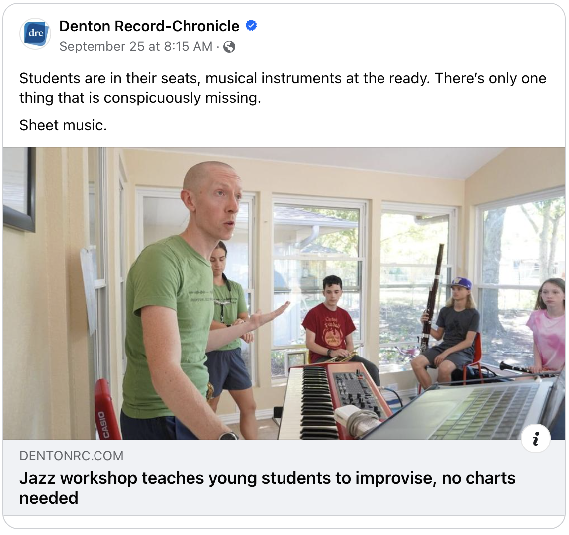 The Institute for Creative Music (IfCM) is a 501c3 non-profit operating in Denton, Texas. All ages, instrument/voice-types, and experience levels, are welcome to join us for workshops, camps, group lessons, and performances that feature jazz and creative music. Come learn and play with our teaching artists in the Denton Jazz Workshops (ages 11+), Creative Music Kids (ages 0-12) and participate in a performance workshop with the IfCM Collective.
